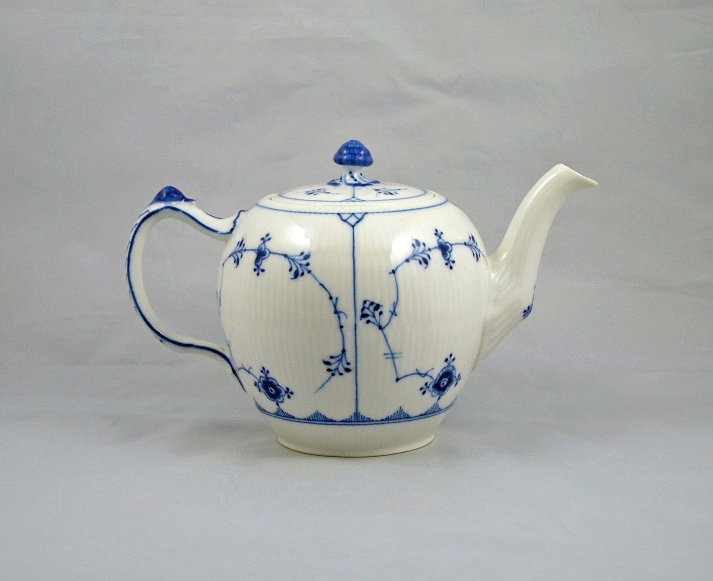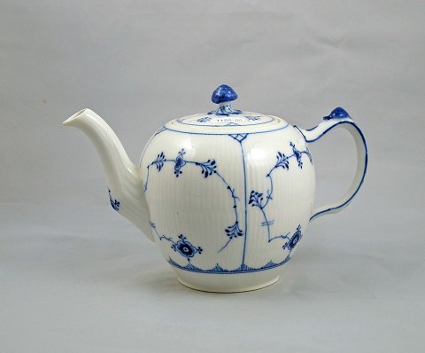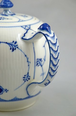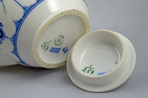 Musselmalet riflet tekande (nr. 1/259) fra Royal Copenhagen. Kanden blev produceret i perioden år 1898 - ca. 1922. Tekanden er fra 1. sortering og i meget pæn stand. Højde: 13,5 cm. Ø: 14 cm.