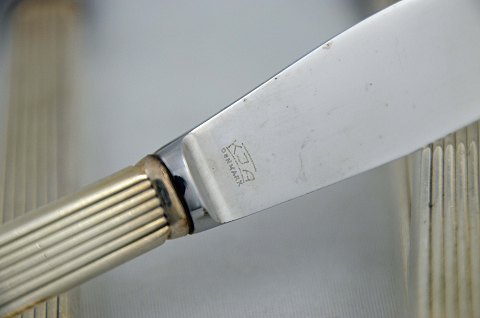 Knive model "Torino" designet af Kristian J. Andersen, Fredericia sølv. Knivene er stemplet KJA, Danmark. Knivene har en længde på 19,5 cm. Med brugsspor