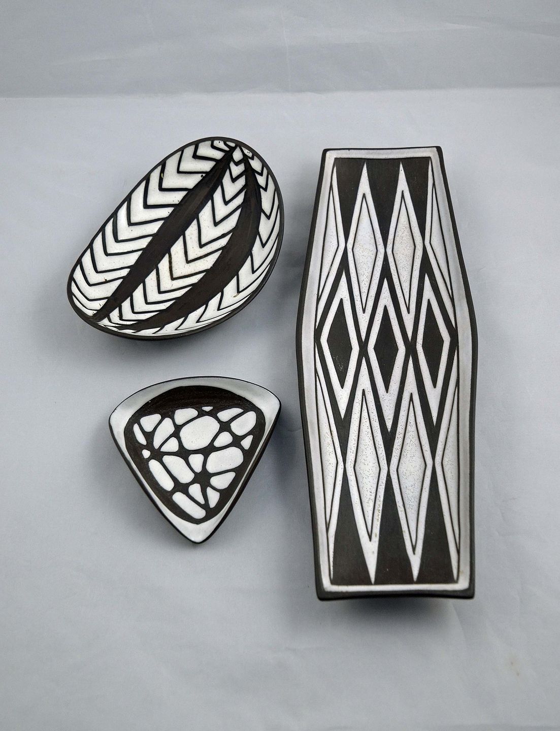 To fade og et askebæger med grafiske motiver med afrikansk inspiration. Michael Andersen, Bornholm Keramik, Design Marianne Starck. De er alle i meget pæn stand.