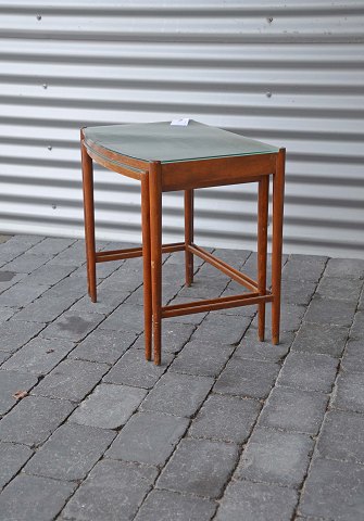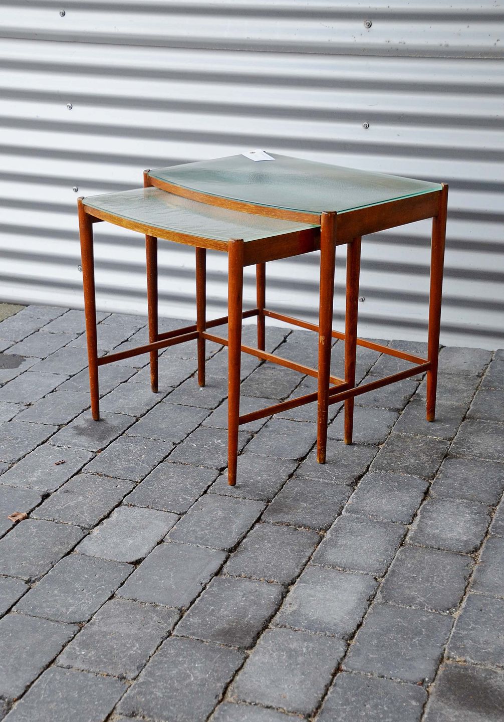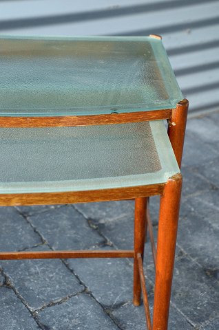 Indskudsborde med glasplader. Det øverste bord har et lille afslag på undersiden af glaspladen. H: 53 cm. B: 57 cm. D: 39 cm.
