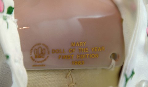 Årsdukke. Porcelænsdukke på stativ - Mary, Doll of the year 1983, First edition fra Bing og Grøndahl. Dukken er i perfekt stand. H: 37,5 cm. B: 18 cm.