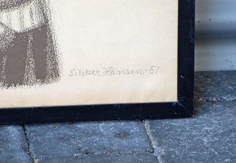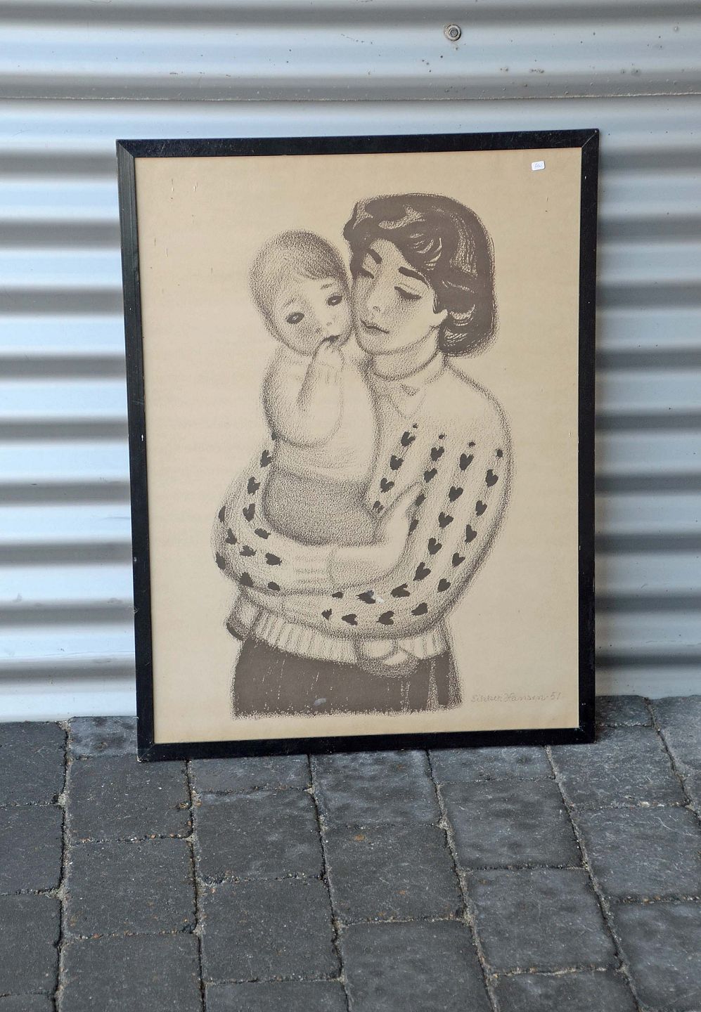Indrammet print af Sikker Hansen fra 1951 med motiv af kvinde med barn på armen.