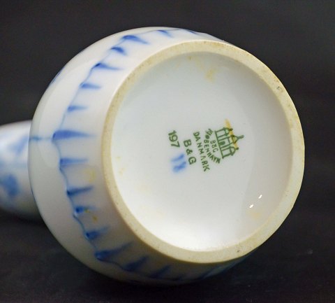 Blåmalet eddikekande (nr.197) fra Bing og Grøndahl. B&G musselmalet kande er 2. sort. og i meget pæn stand. H: 14 cm. Ø: 6 cm.