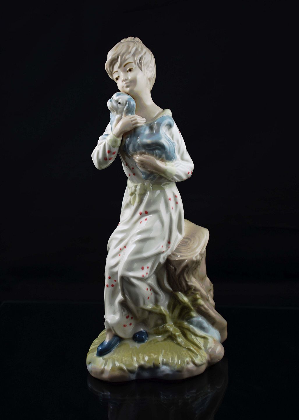 Spansk figur i porcelæn med motiv af stående kvinde med hund