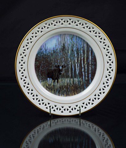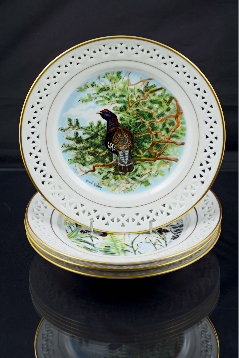 4 stk platter af Bing og Grøndahl med motiv af Djur i natur/ dyr i natur. Motiverne er efter Harald Wiberg og platterne er med intakt gylden kant. De er fra 1. sort og i meget pæn stand.