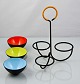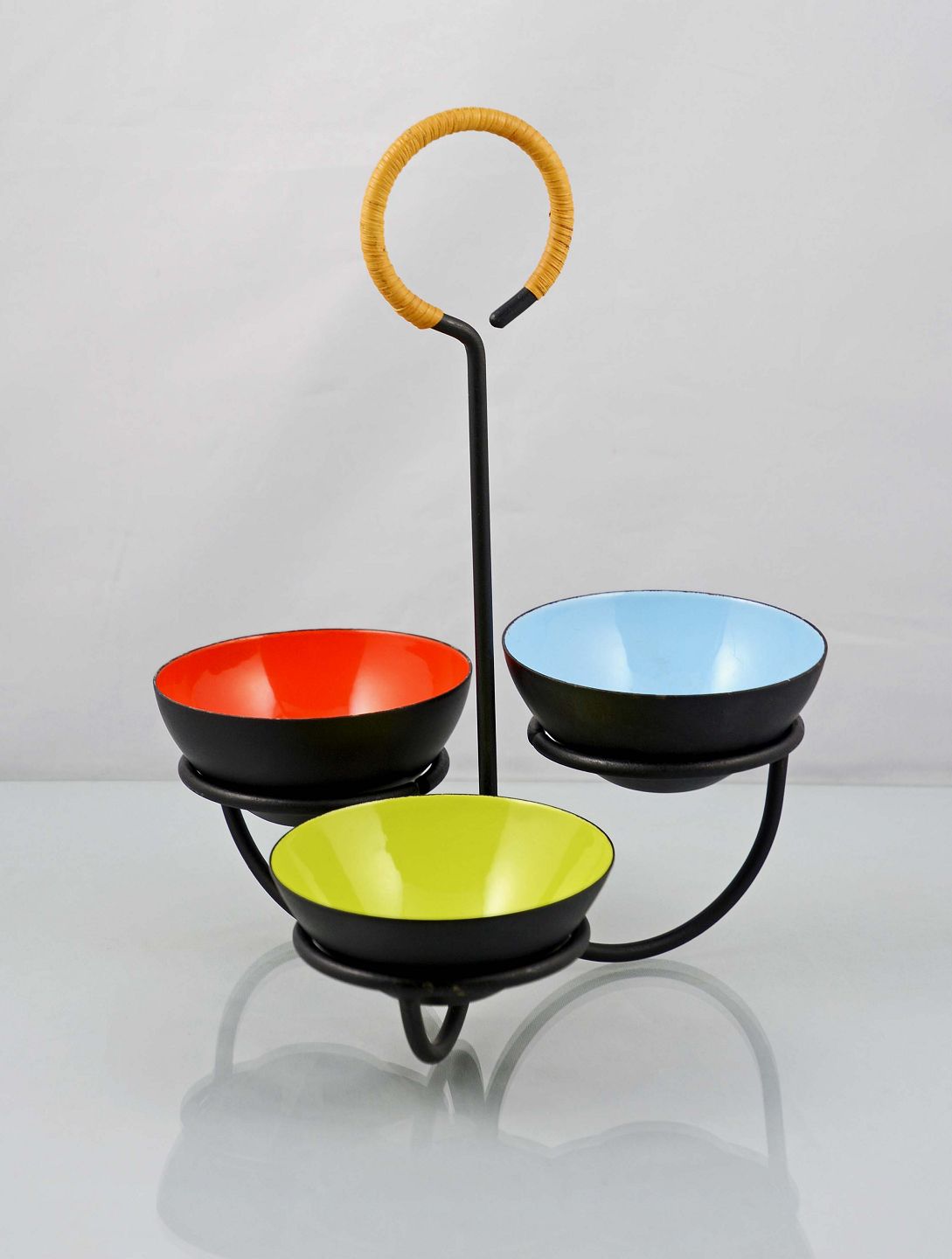 Et sæt med tre små krenit skåle med holder i sortmalet metal og bambusflet.