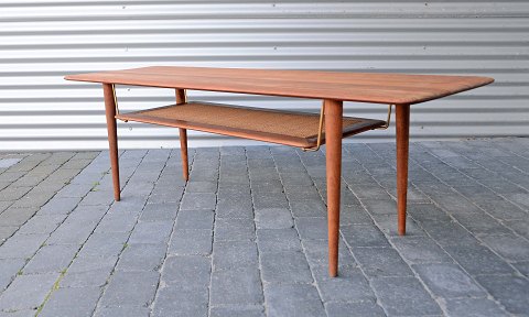 Sofabord i massiv teaktræ med underhylde i teak og flet designet af Peter Hvidt & Orla Mølgaard. Bordet er i meget pæn stand med intakt flet. H. 50 cm. L. 152 cm. B. 50 cm.