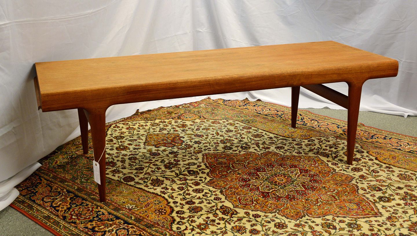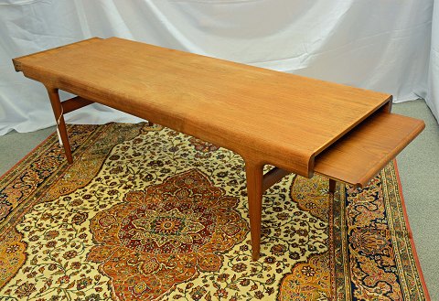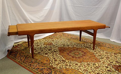 Sofabord i teaktræ designet af Johannes Andersen. Bordet har en skuffe og en udtrækshylde. Bordet er i pæn stand.