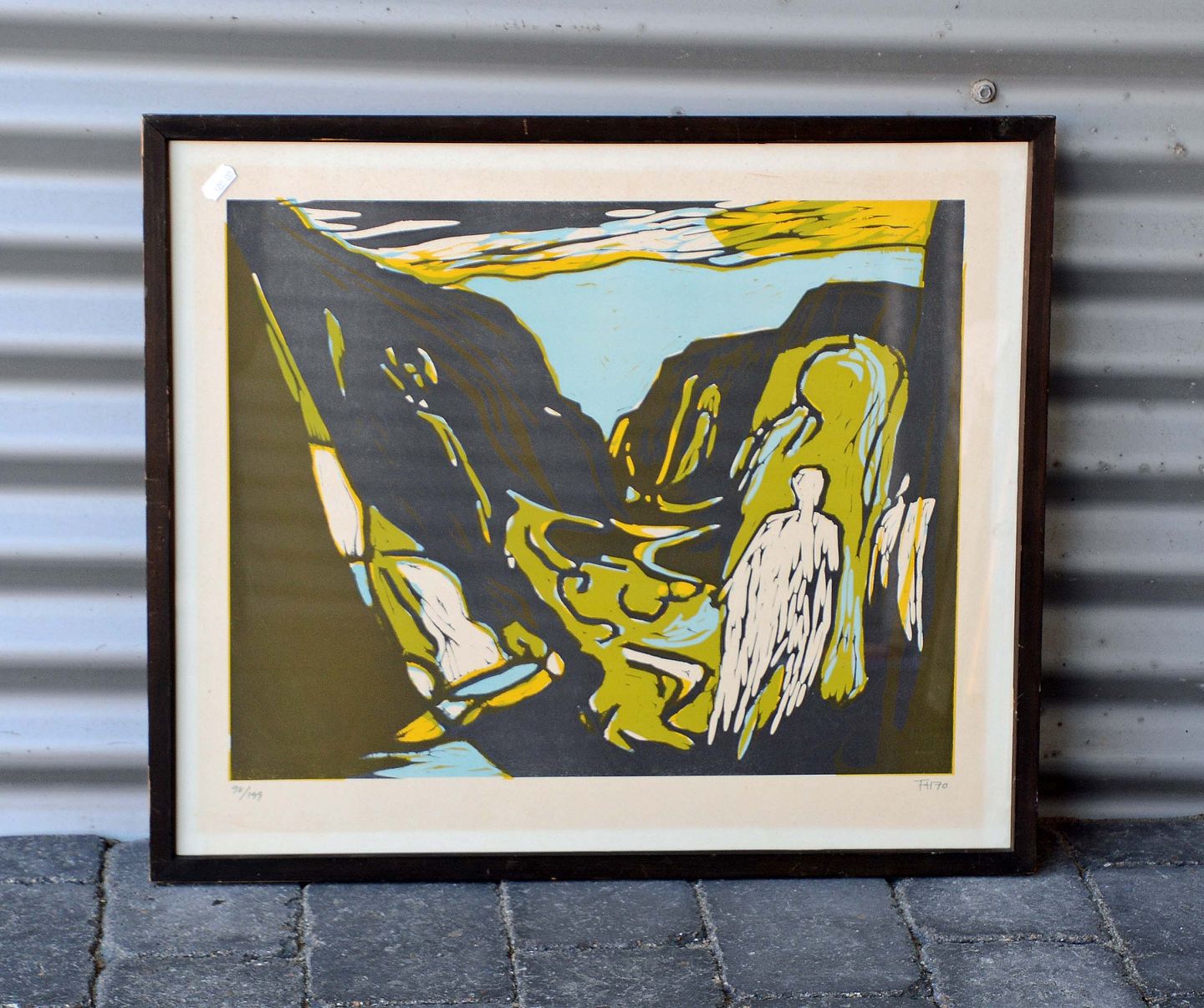Litografi med motivi af abstrakt landskab. Signeret "FH 70".