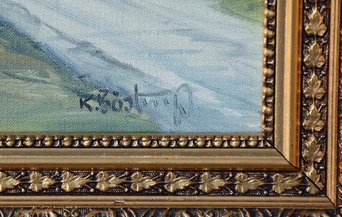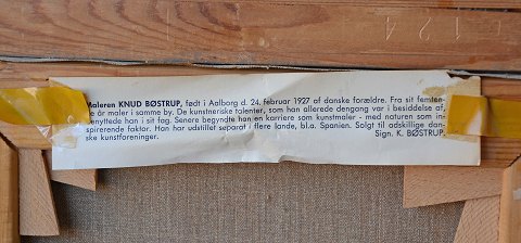Maleri på lærred af Knud Bøstrup. Motiv huse ved vej. Signeret " K. Bøstrup". Meget pæn stand. Aldersrelaterede brugsspor.