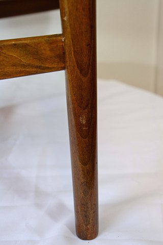 Lænestol model 215 design Kurt Olsen. Produceret på Slagelse møbelfabrik november 1954. Stel af egetræ. Betrukket med møbelstof. Brugsspor ved armlæn. Pæn stand.