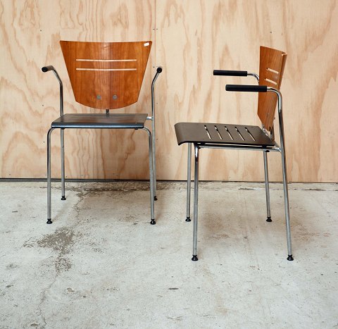 CAT konference-stole fra Rumas, Denmark designet af arkitekt Troles Grum-Schwensen. Stel af crom med træsæder og slidstærke håndtag af purgummi. Kan stables. Lette brugsspor ellers i pæn stand.