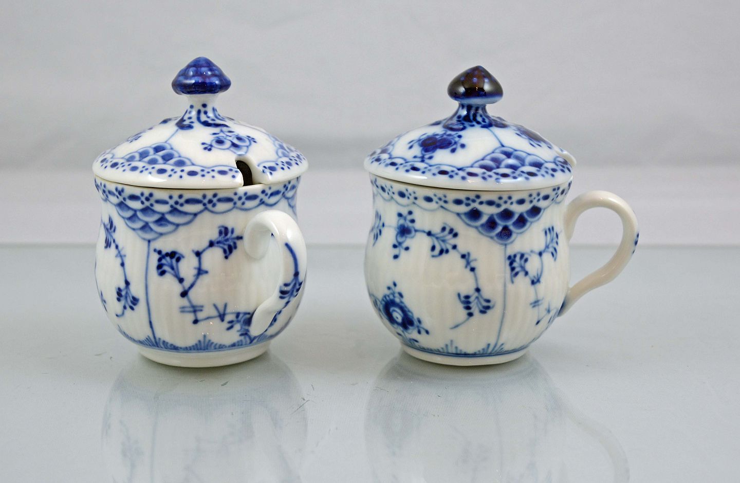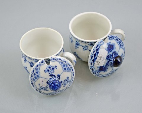 2 stk. små kopper med låg (nr. 1/743-44 og 1/743-44) i musselmalet halvblonde fra Royal Copenhagen. Begge fra 1. sort. Meget pæn stand.