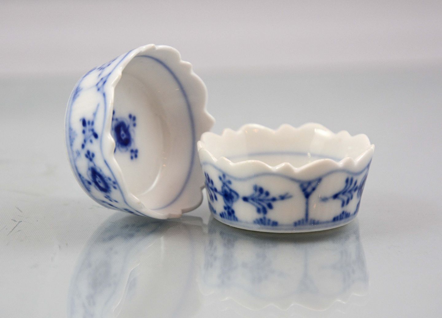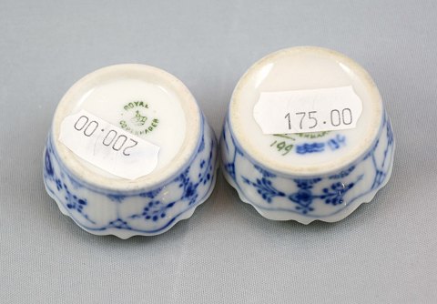 Musselmalet saltkar(1/199) fra Royal Copenhagen. 1. sort. Meget pæn stand. H. 1,7 cm. Ø. 4,5 cm.