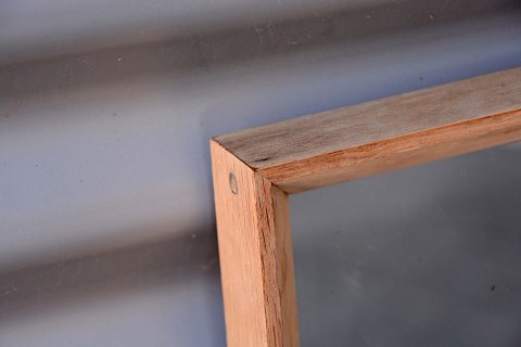 Spejl med ramme i egetræ. Brugsspor på rammen ellers pæn stand. Enkelte små sorte pletter i glas