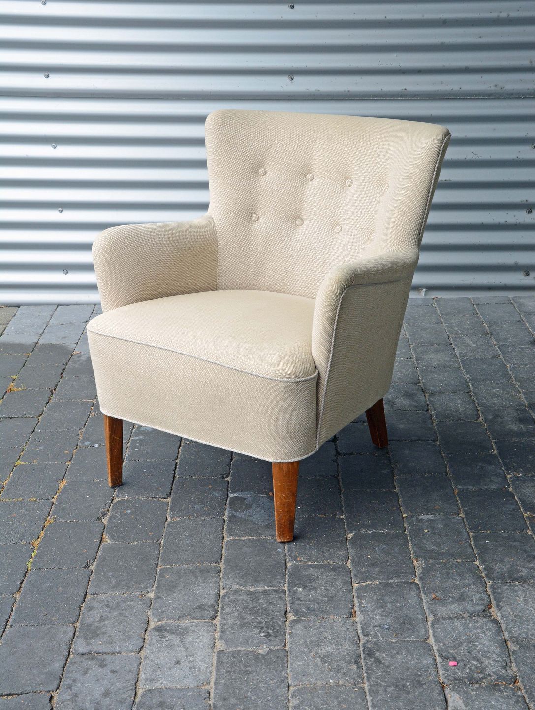 Lænestol model 1748 af Peter Hvidt for Fritz Hansen. Betrukket med stof. Aldersrelaterede brugsspor. Pæn stand.solgt