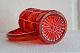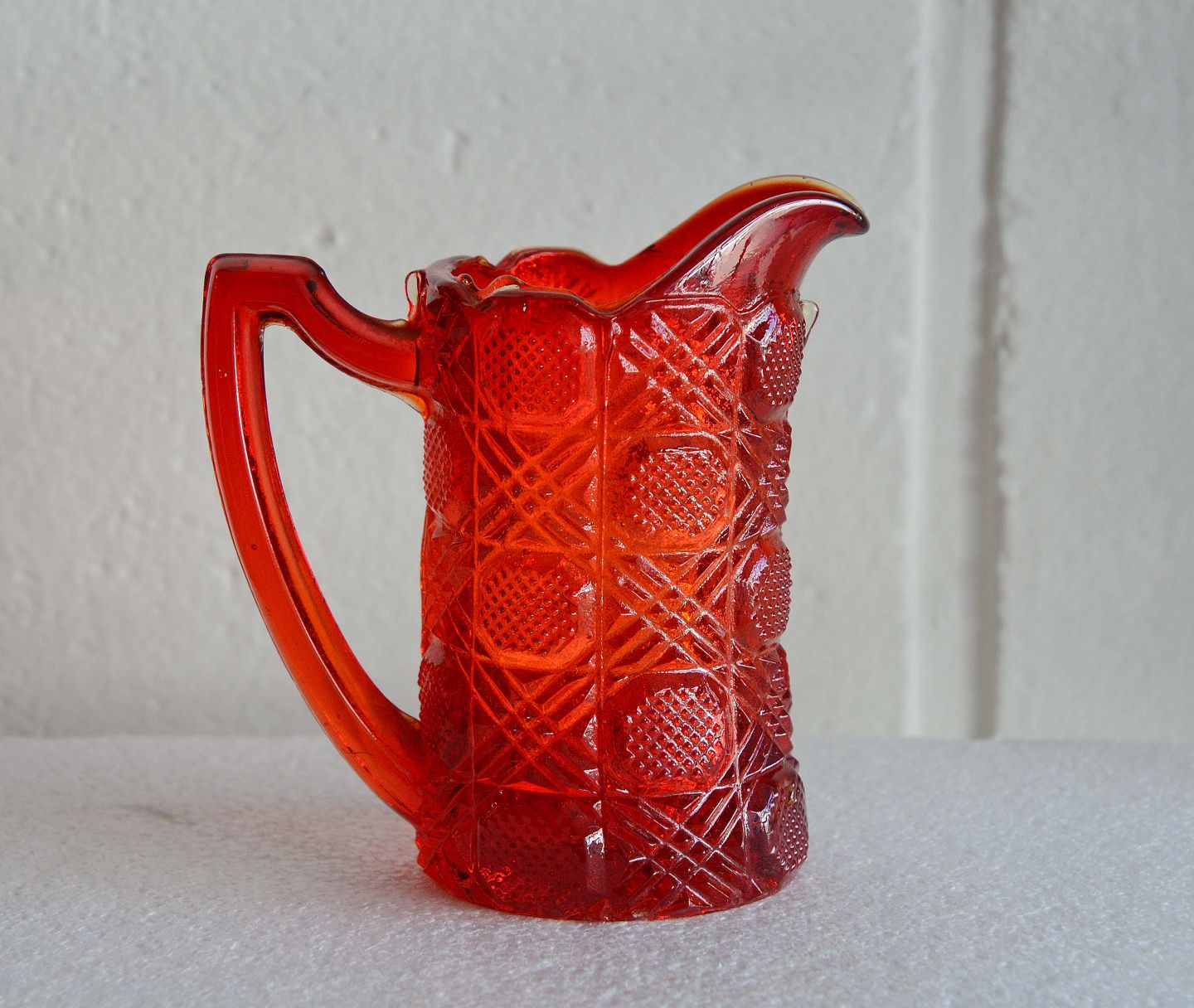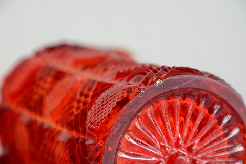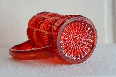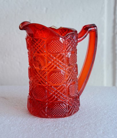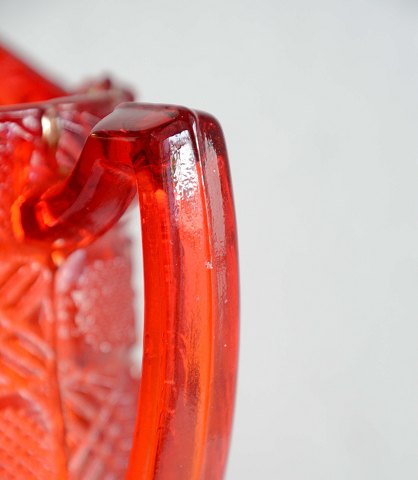 Rubinrød flødekande presset glas fra Fyns glasværk år 1924.