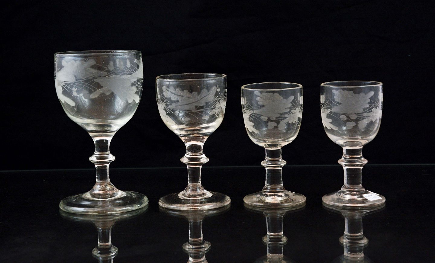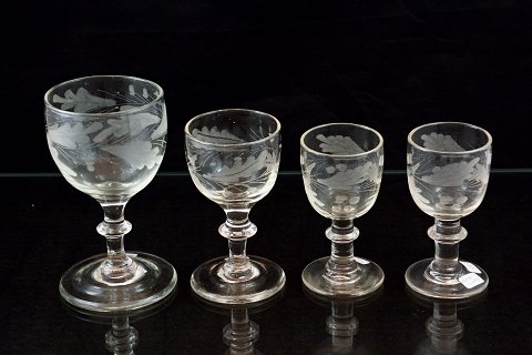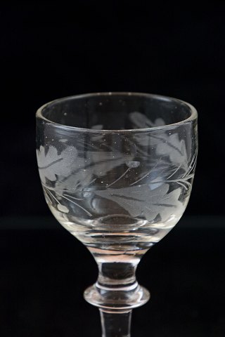 Egeløv glas fra Holmegaard. Glassene er fra år ca. 1850. Intakte og i pæn stand. Glasset har 2 agern i ranken rundt på glasset.