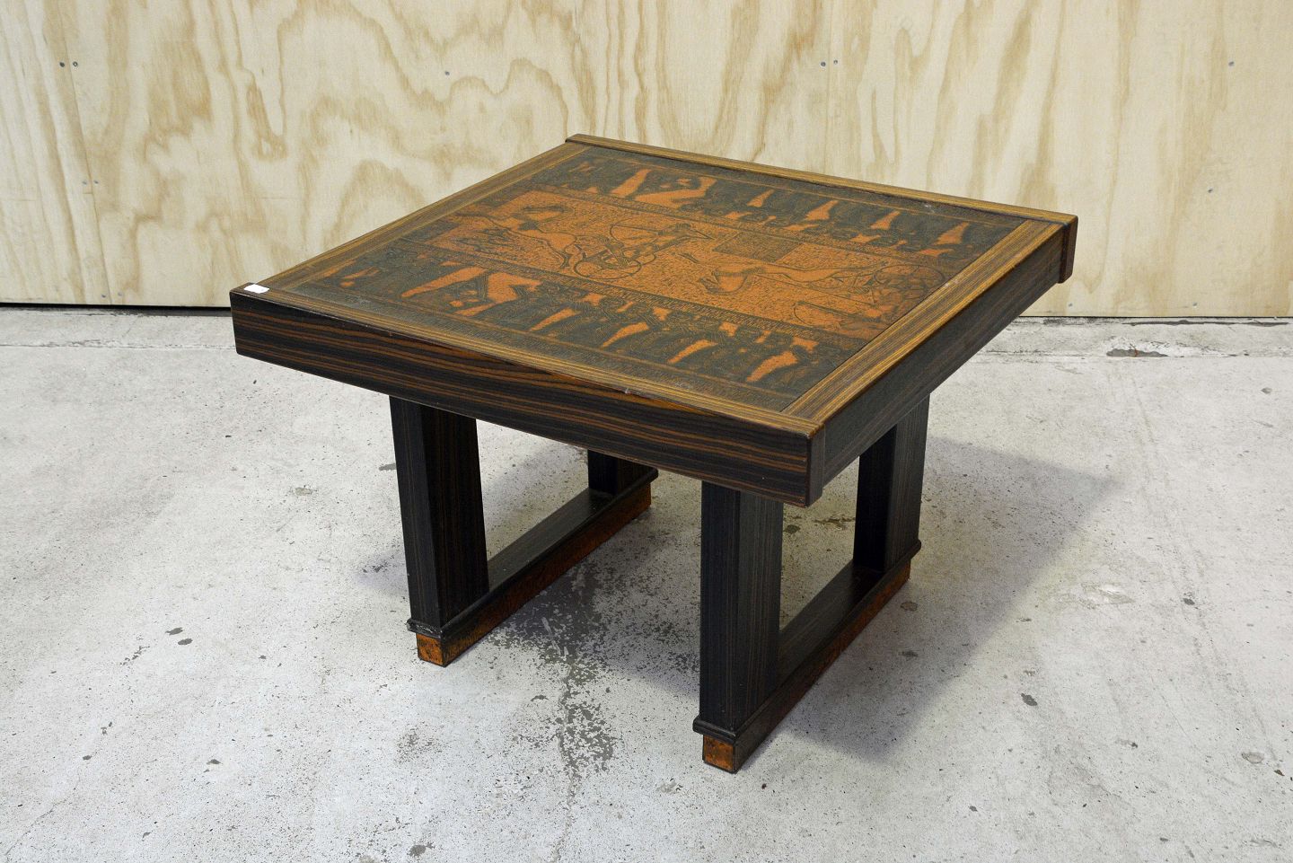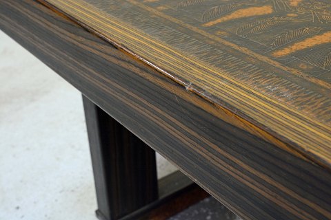 Sofabord i palisander med topplade og sokkel omsluttet i kobber med egyptiske motiver. Brugsspor - mindre hak i bordkanten samt alm. brugsspor.