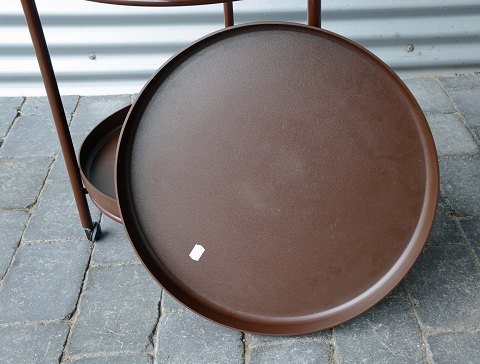 Bakkebord med flytbar bakke i plast og stel af brunt lakeret metal. Brugsspor.