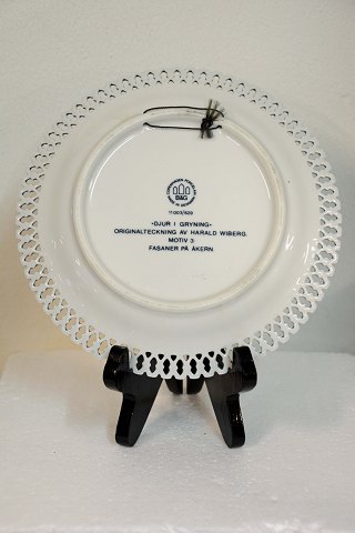 Platte. "Fasaner på Åkern" (nr. 11003/629). Motiv nr. 3 i serien "Djur i gryning". Tegning af Harald Wiberg fra Bing og Grøndahl. Intakt. 1. sort.