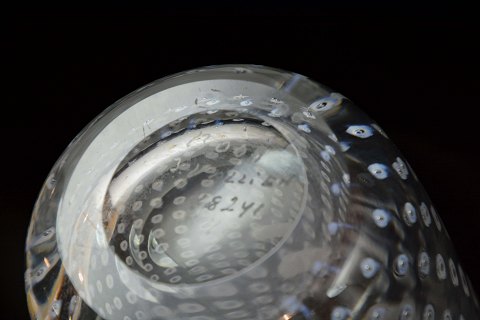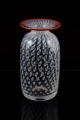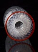 Glasvase med mønster og rød kant (nr. 48241) designet af Bertil Vallion for Kosta Boda Fors. Intakt med enkelte ridser under bunden.