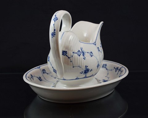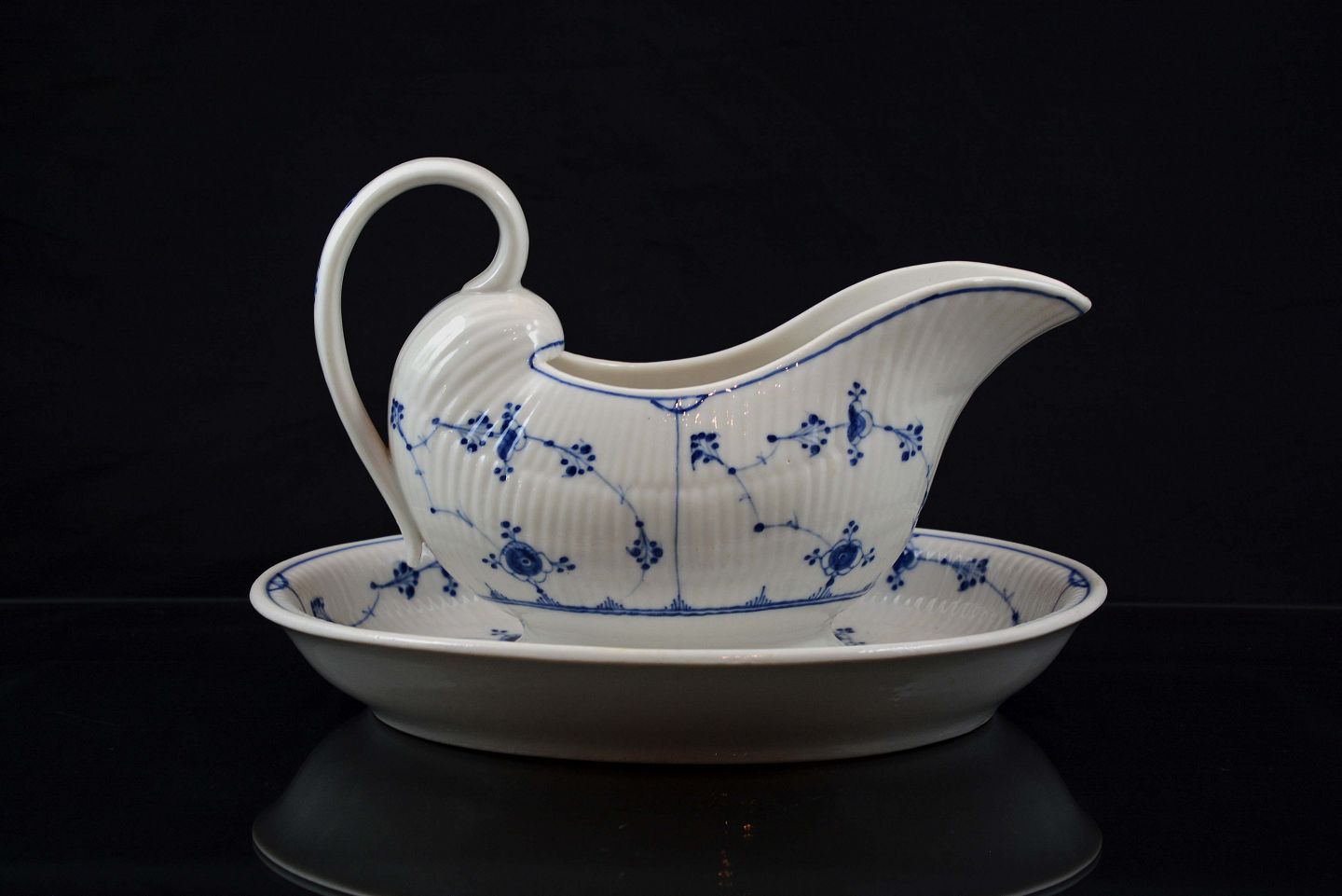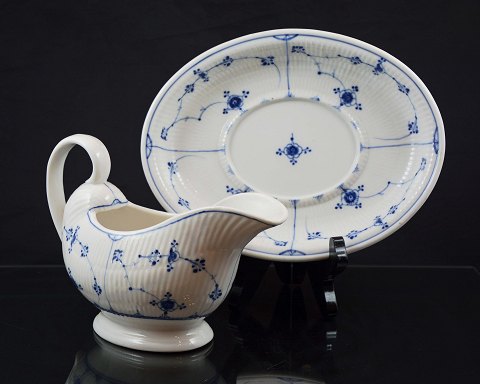 Kongeligt musselmalet riflet saucekande med underfad. Fremstillet år 1870-1890. Intakt.