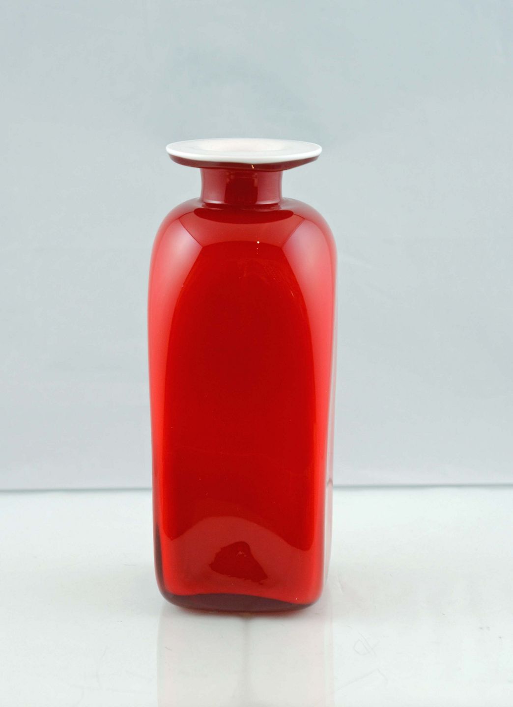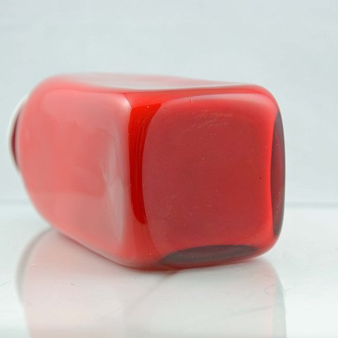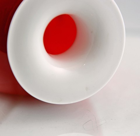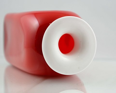 Capri Carnaby vase i opalhvidt glas med koralrødt overfang af Jacob E Bang for Kastrup Holmegaard. Minimal nøk i toppen.