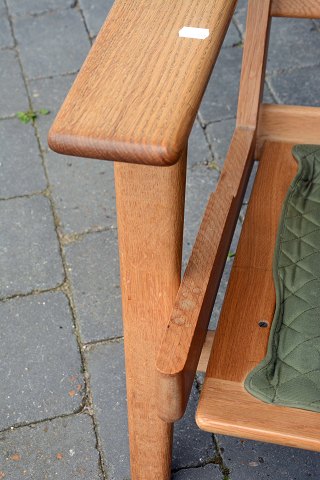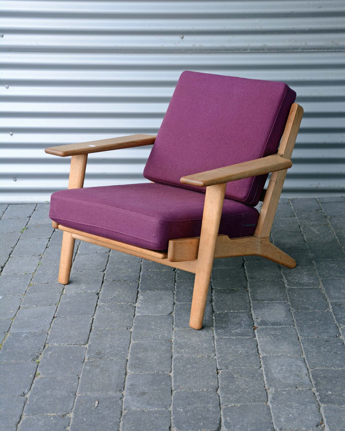 Lav lænestol model GE 290 i eg designet af Hans J. Wegner. Den viste stol er solgt, men vi har med andet stof i butikken.