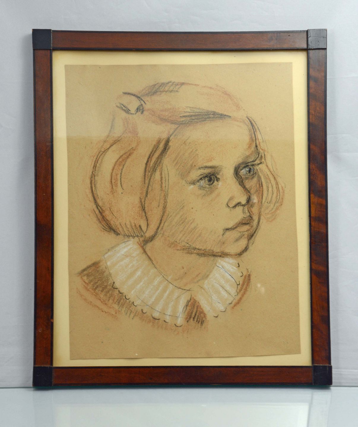 Indrammet tegning med portræt af en pige. Usigneret. Ifølge barnebarn til Ane Brygger er det lavet af denne. Brugsspor på rammen.