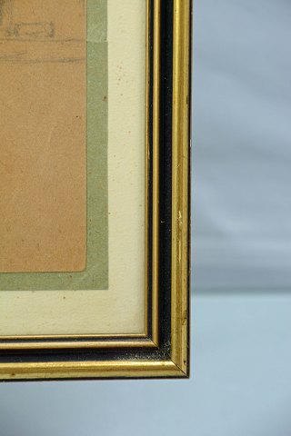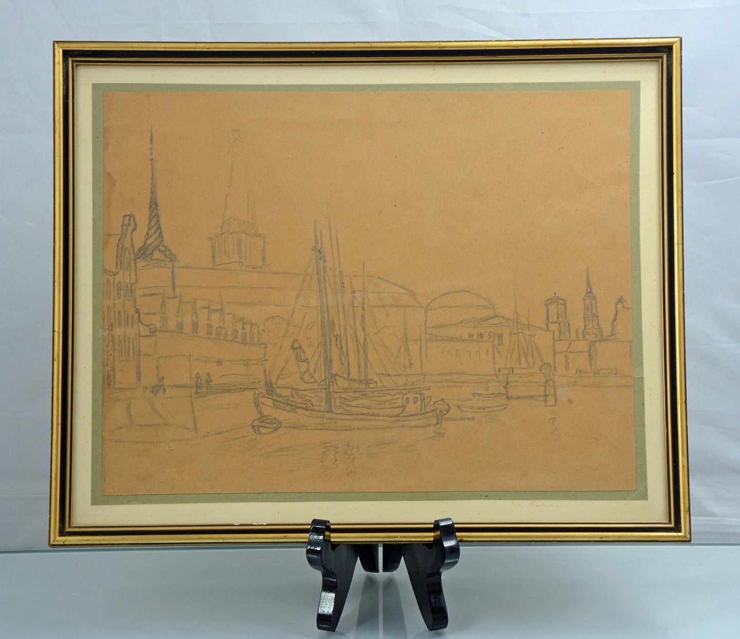 Indrammet Tegning med motiv af sejlbåde i havneområde af Johan Rohde. Signeret. Brugsspor på rammen.