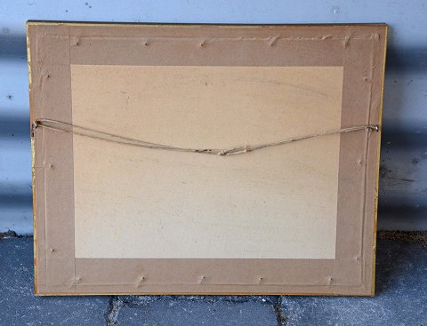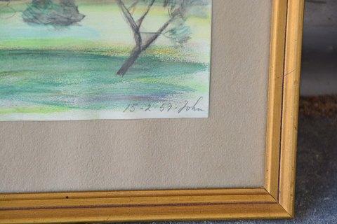 Tegning med motiv af huse og natur signeret "John 15/2-59". af B. Johannesen. Intakt med brugsspor på rammen.