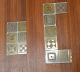 Et sæt Indskudsborde i teaktræ med gyldne kakler med forskellige motiver designer af Bjørn Wiinblad. Kaklerne på bordet er en del af i serien "Quatre Couleurs". Fremstår med meget få brugsspor - ridser.
