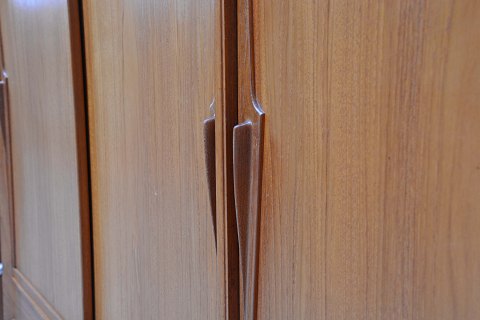Omann Junior skænk i teaktræ med to skuffer, fire skydelåger og indvendigt seks udtræksbakker og hylder. Skænken/dækketøjsskab fremstår med enkelte brugsspor - ridser.