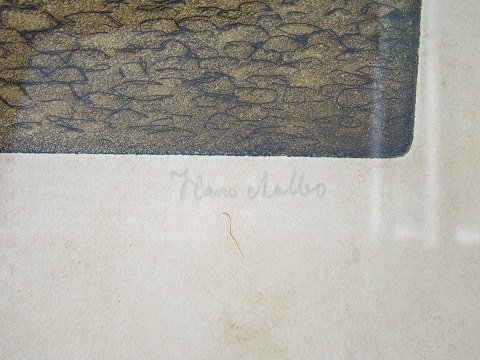Indrammet Aalborgensirsk motiv af Hans Aalbo med motiv af hus med stengårdmiljø