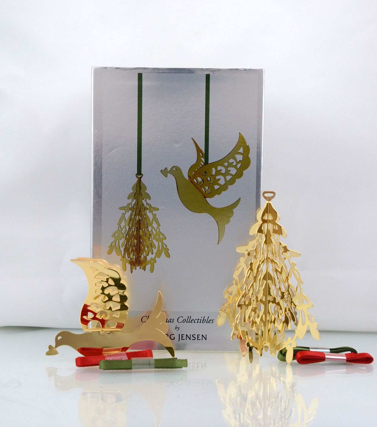 Georg Jensen julepynt. Grantræ og due udført i messing belagt med 24 karats guld. Christmas Collectibles designet af Karen Bit Vejle 2014.