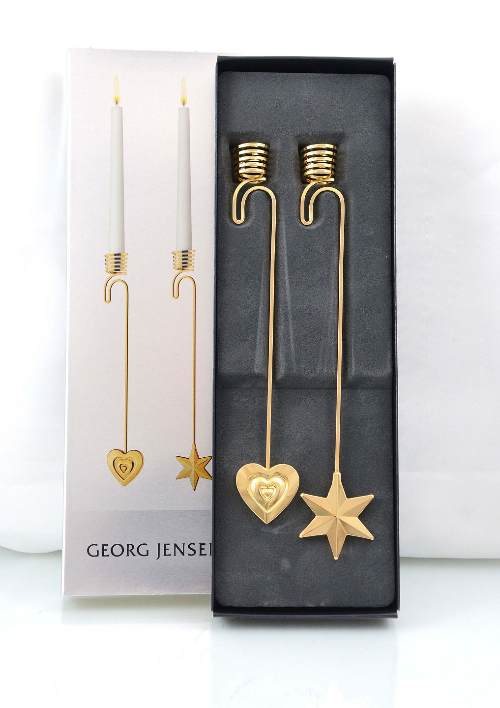 Georg Jensen lyseholdere. Hjerte og stjerne udført i messing forgyldt med 24 karats guld. Designet af Lene Munthe 2010.
