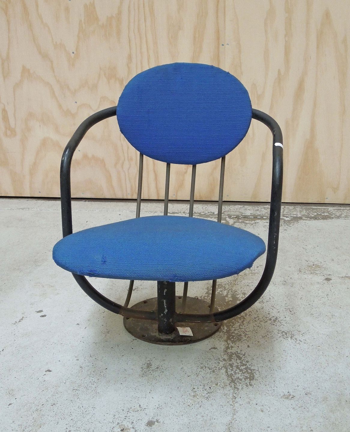 Biografstol med sort metal stel og blå betræk. Skader på polstring.