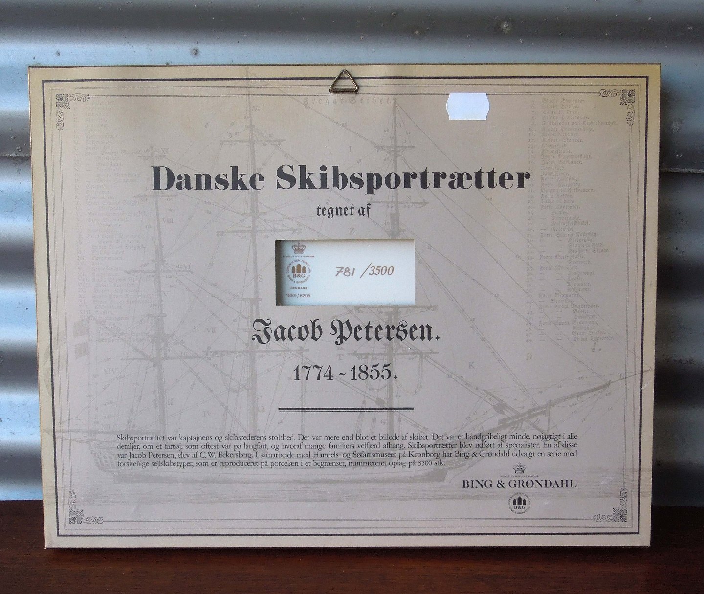 Dansk skibsportræt tegnet af Jacob Petersen 1774-1855. Reproduceret på Bing og Grøndahls porcelæn platte. Nummereret 781/3500
