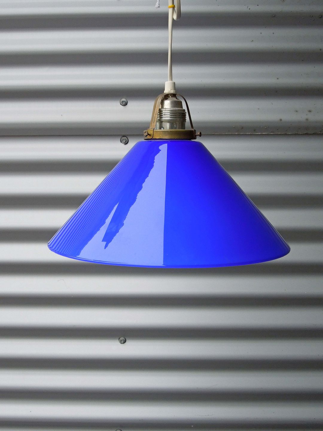 Loftslampe i glas med med messing ophæng. Pendlen er udformet i hvidt glas under blåt overfangsglas. Fremstår med mindre brugsspor.