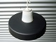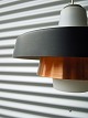 Pendel lampe med sortlakeret metalskærm med kobber og opalhvidt glas. Fremstår med brugsspor på skærmen. Glasset er intakt.