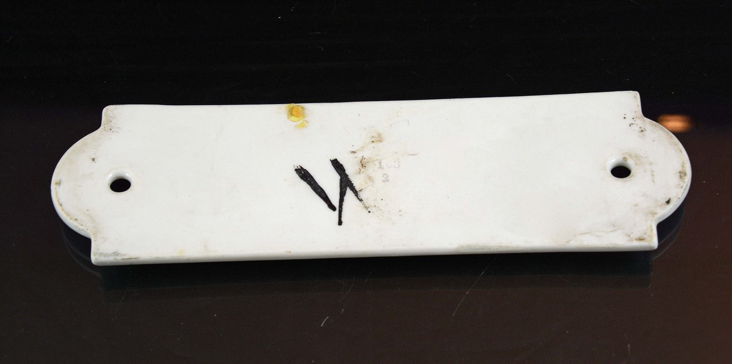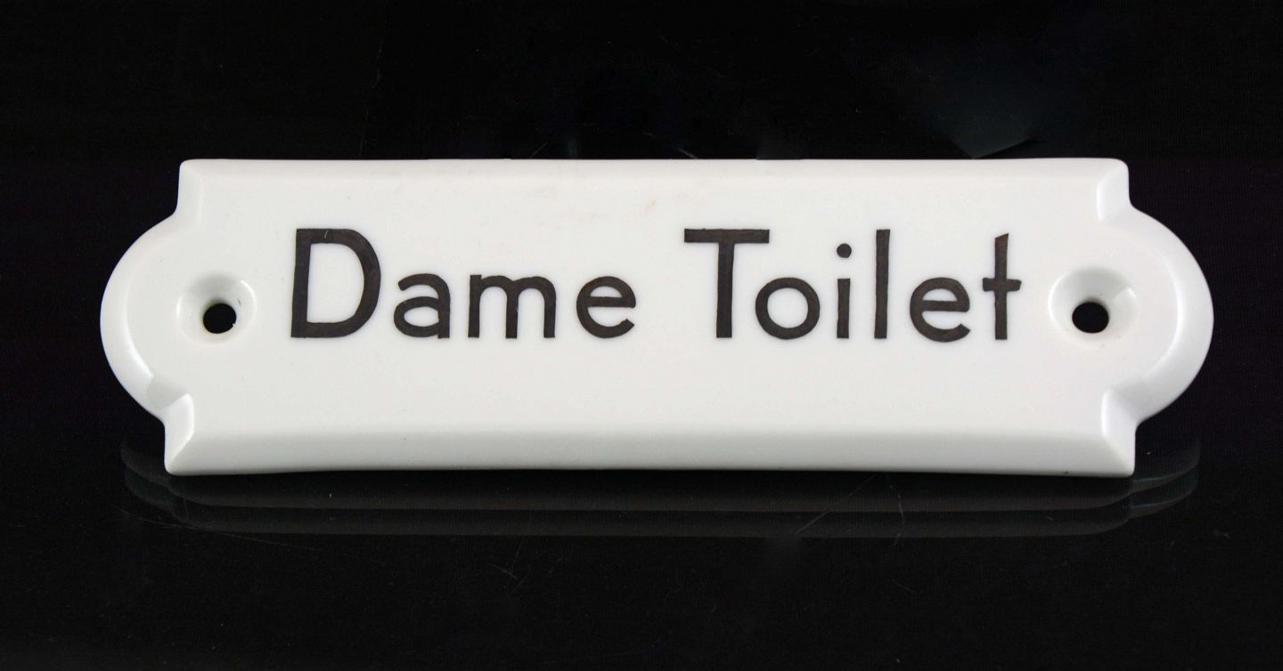 Intakt porcelænsskilt påmalet "Dame toilet"