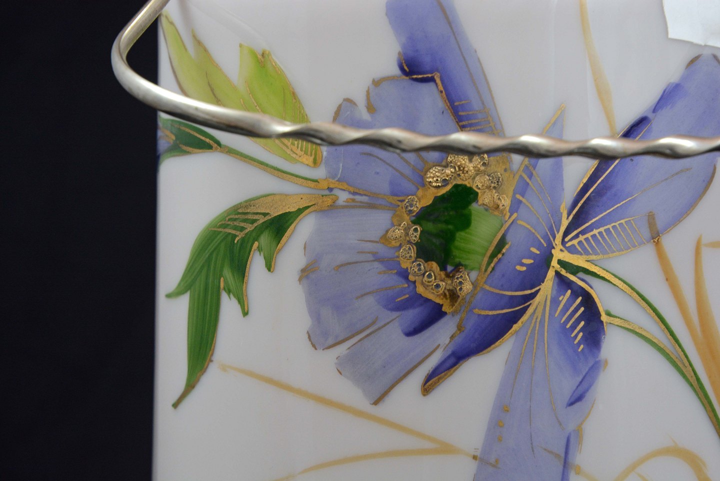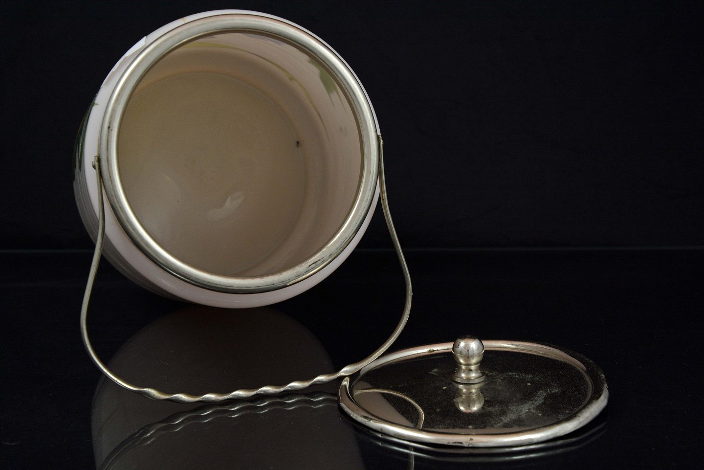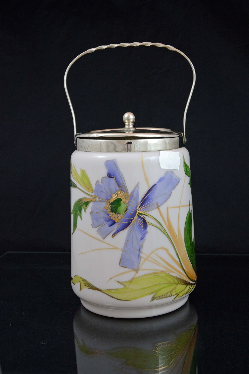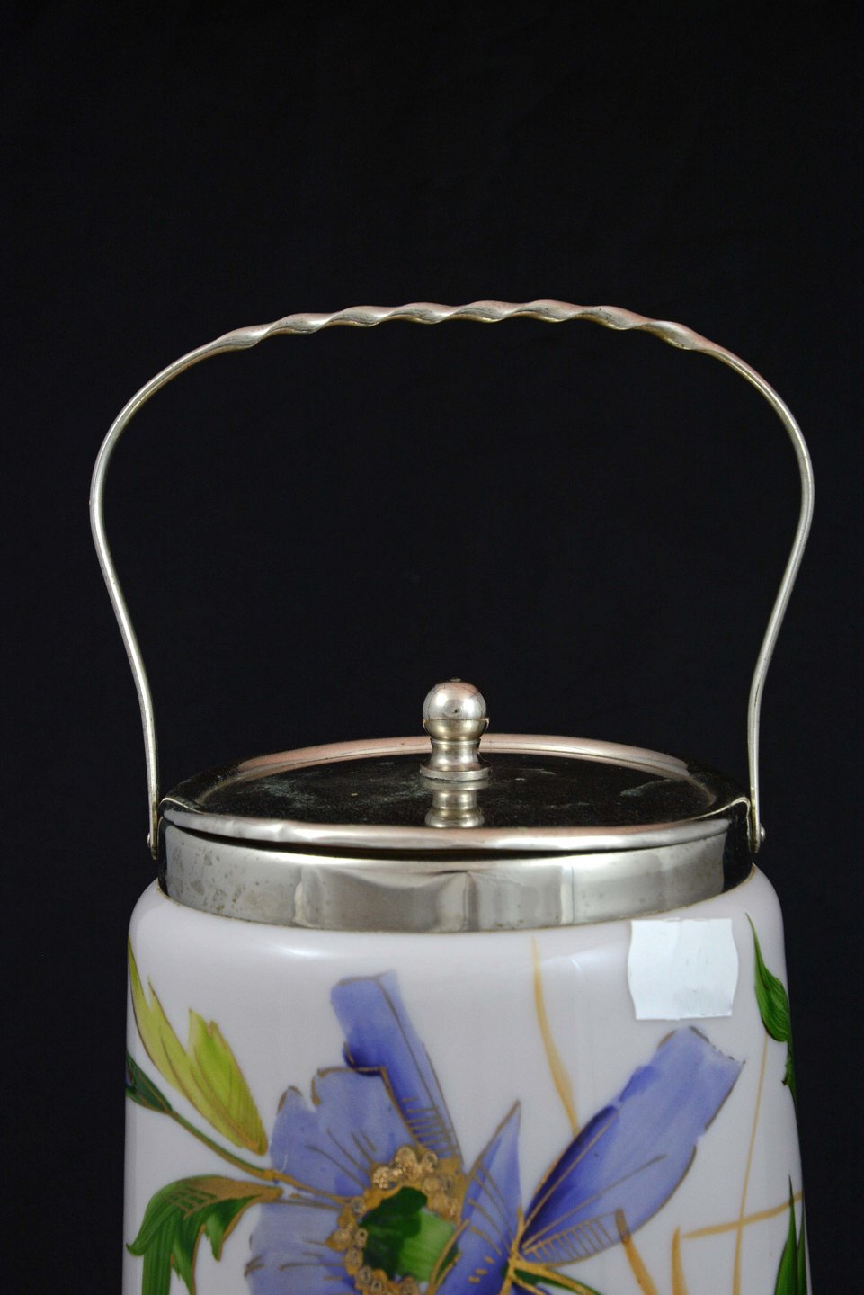 Glas kagekrukke med blå blomst. Krukken er lavet i hvidt glas og låget er fremstillet i sølvbelagt metal.