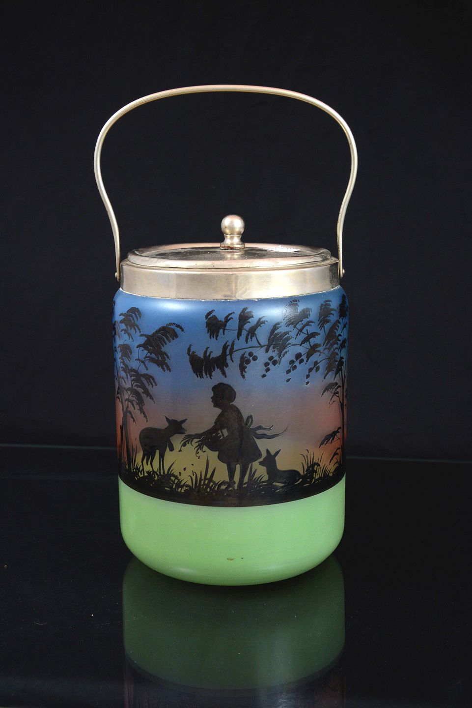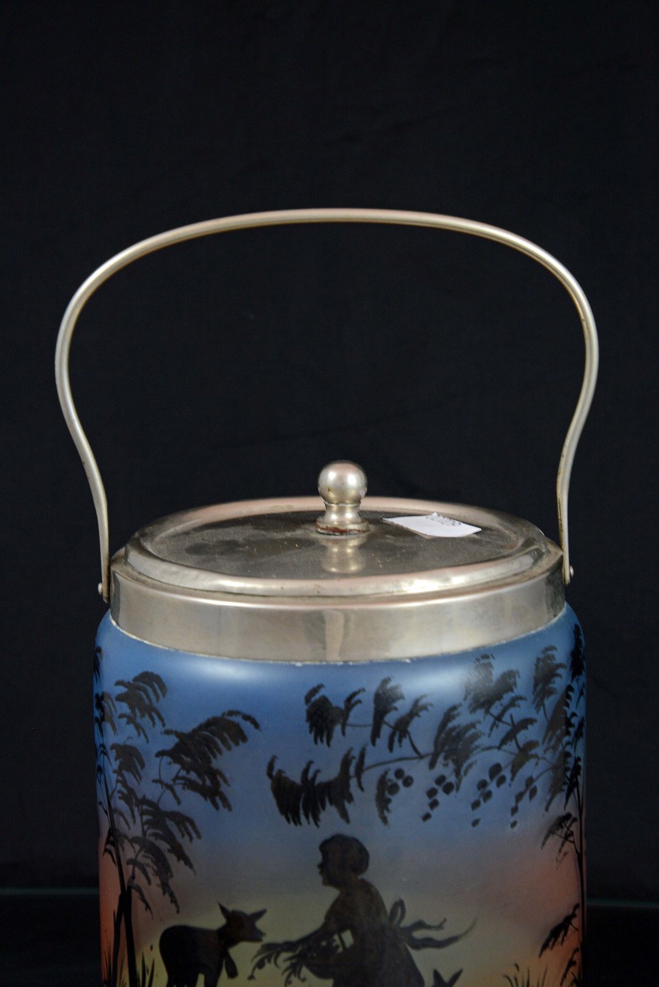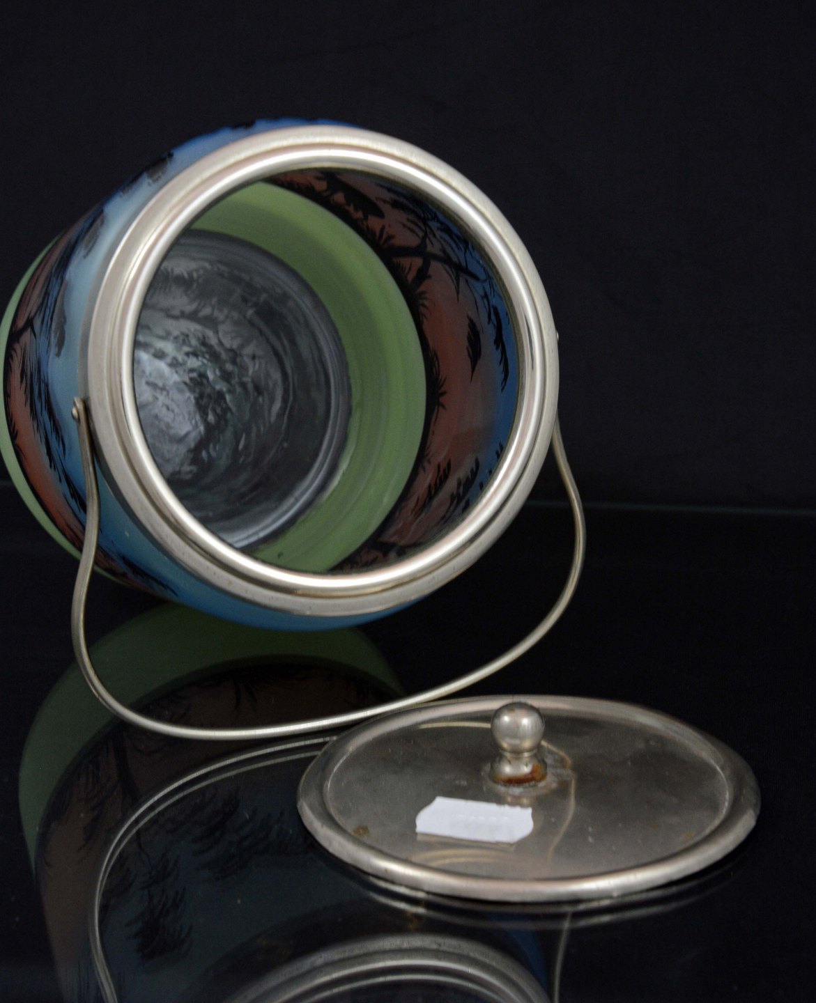 Glas kagekrukke med siluet motiv. Låget er fremstillet i sølvbelagt metal.