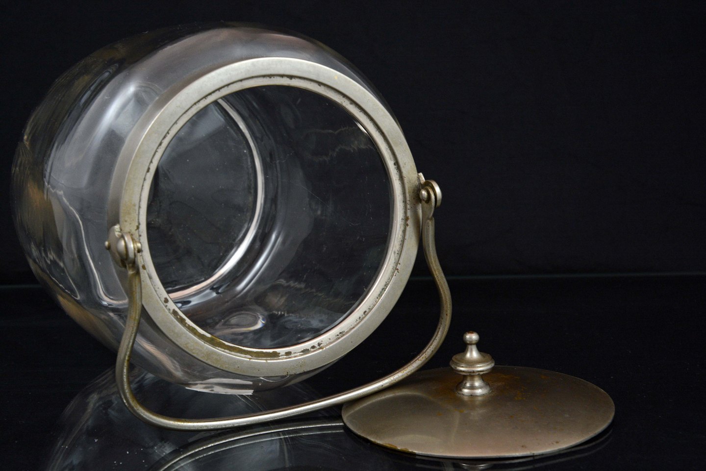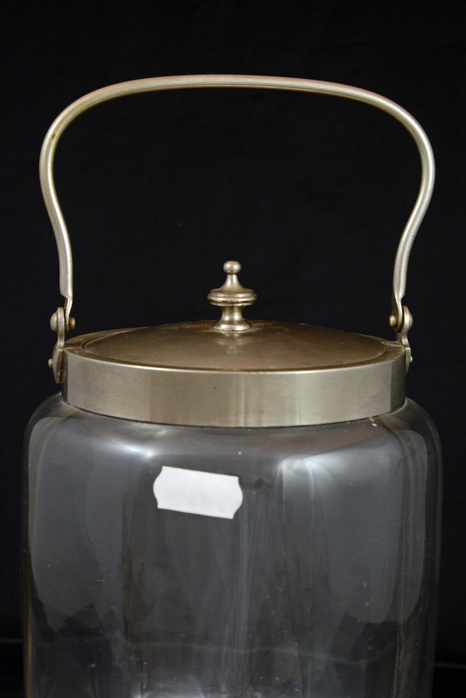 Glas kagekrukke med låg fremstillet i sølvbelagt metal.