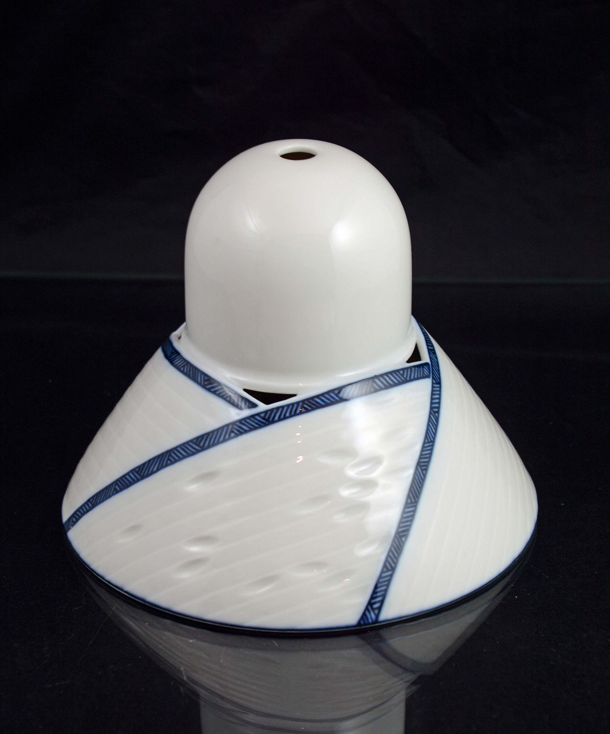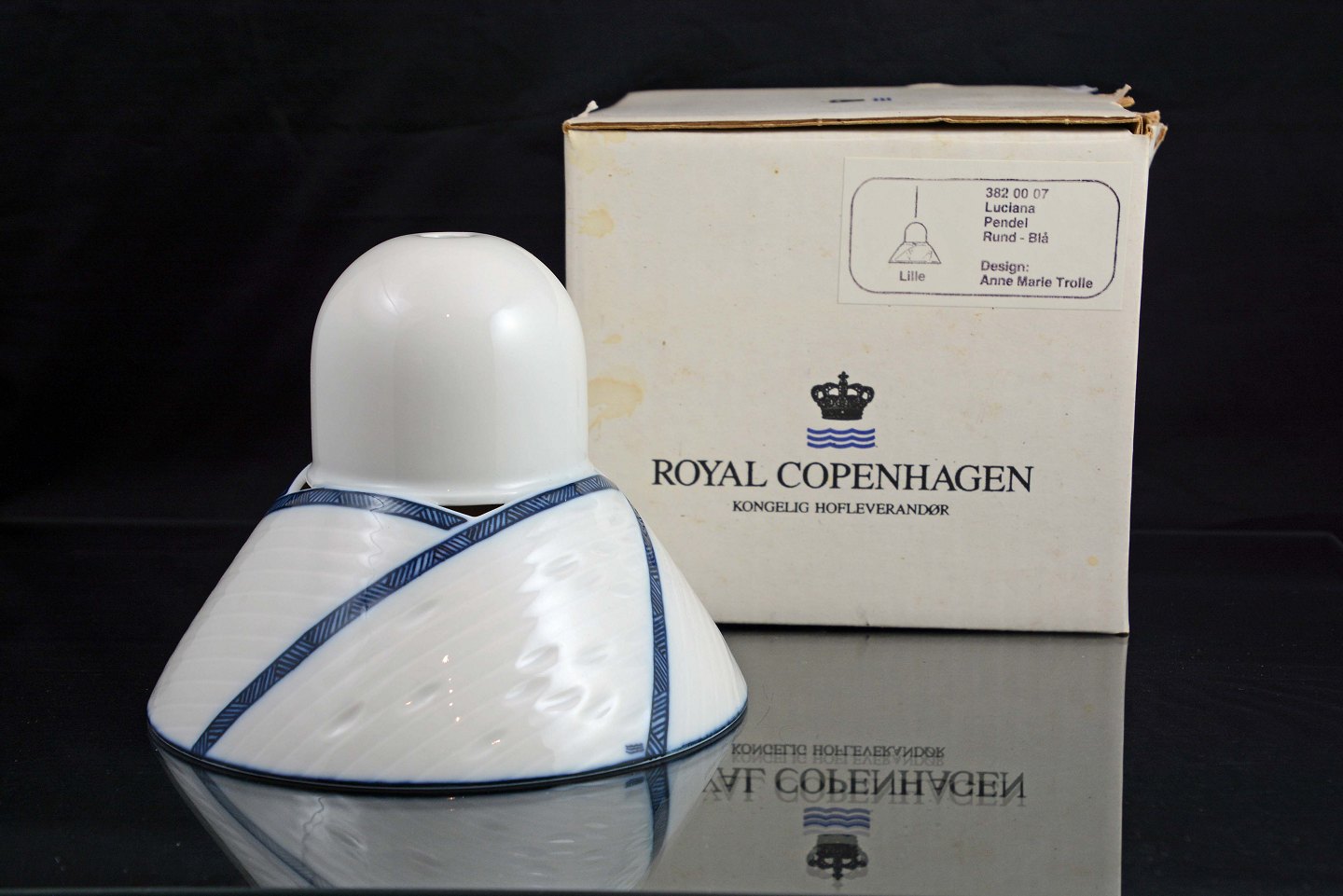 Lille Luciana pendel i porcelæn m/blåt mønster. Designet af Anne Marie Trolle for Royal Copenhagen.