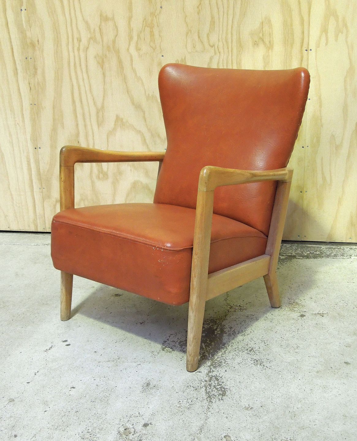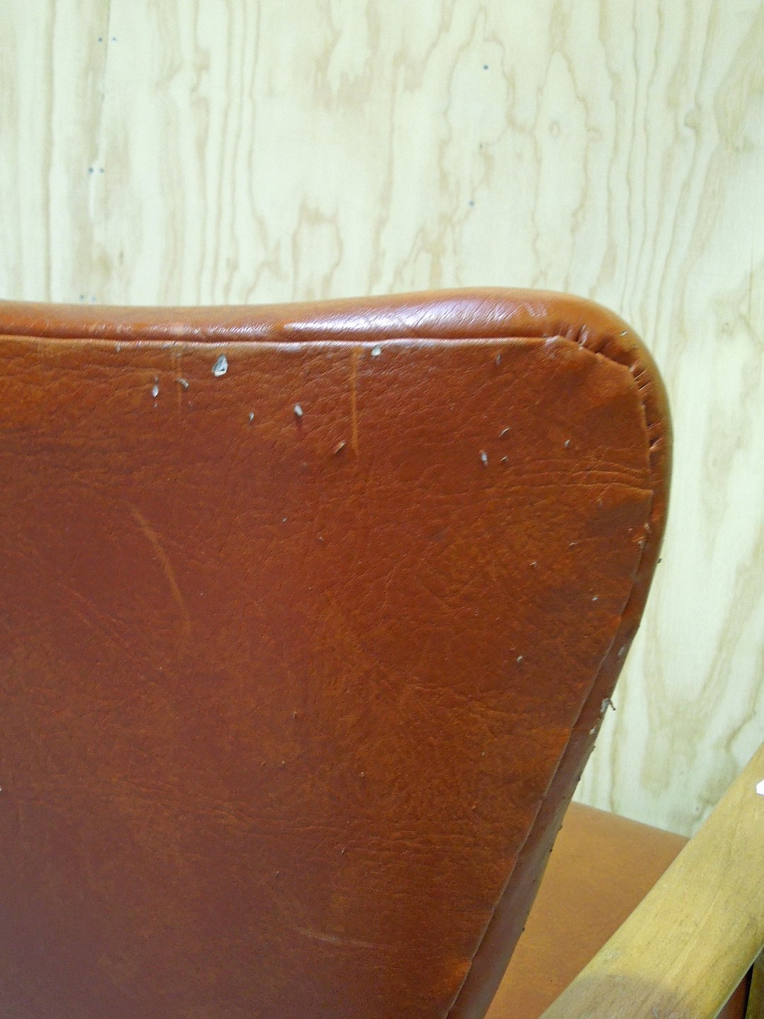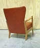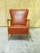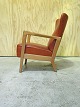 Højrygget brun læder lænestol i eg, designet af Søren Hansen.