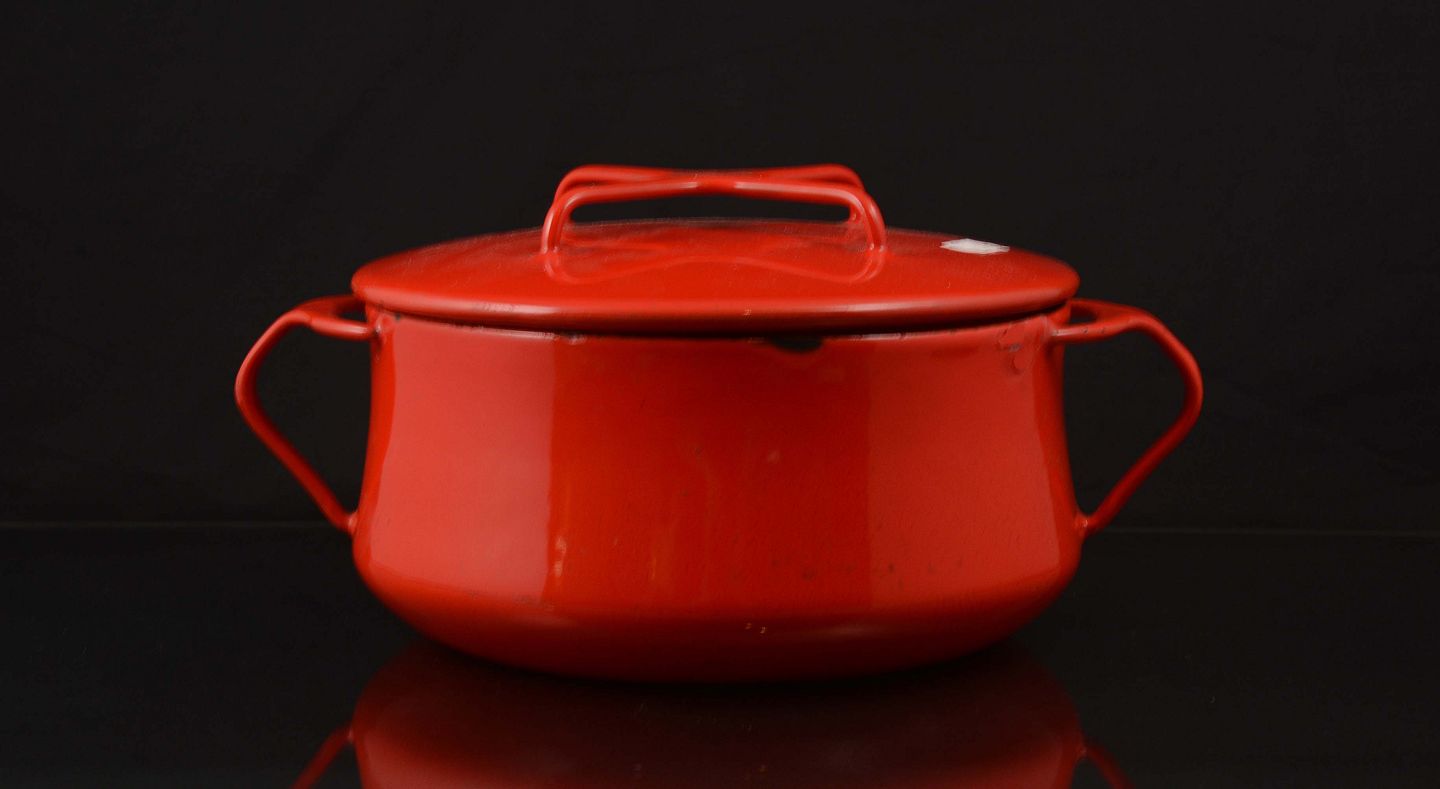 Emalje gryde designet af Jens Harald Quistgaard. Brugsspor i form af ridser og afslag i emaljen.