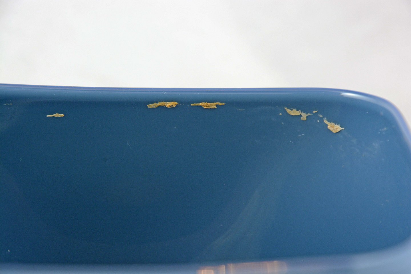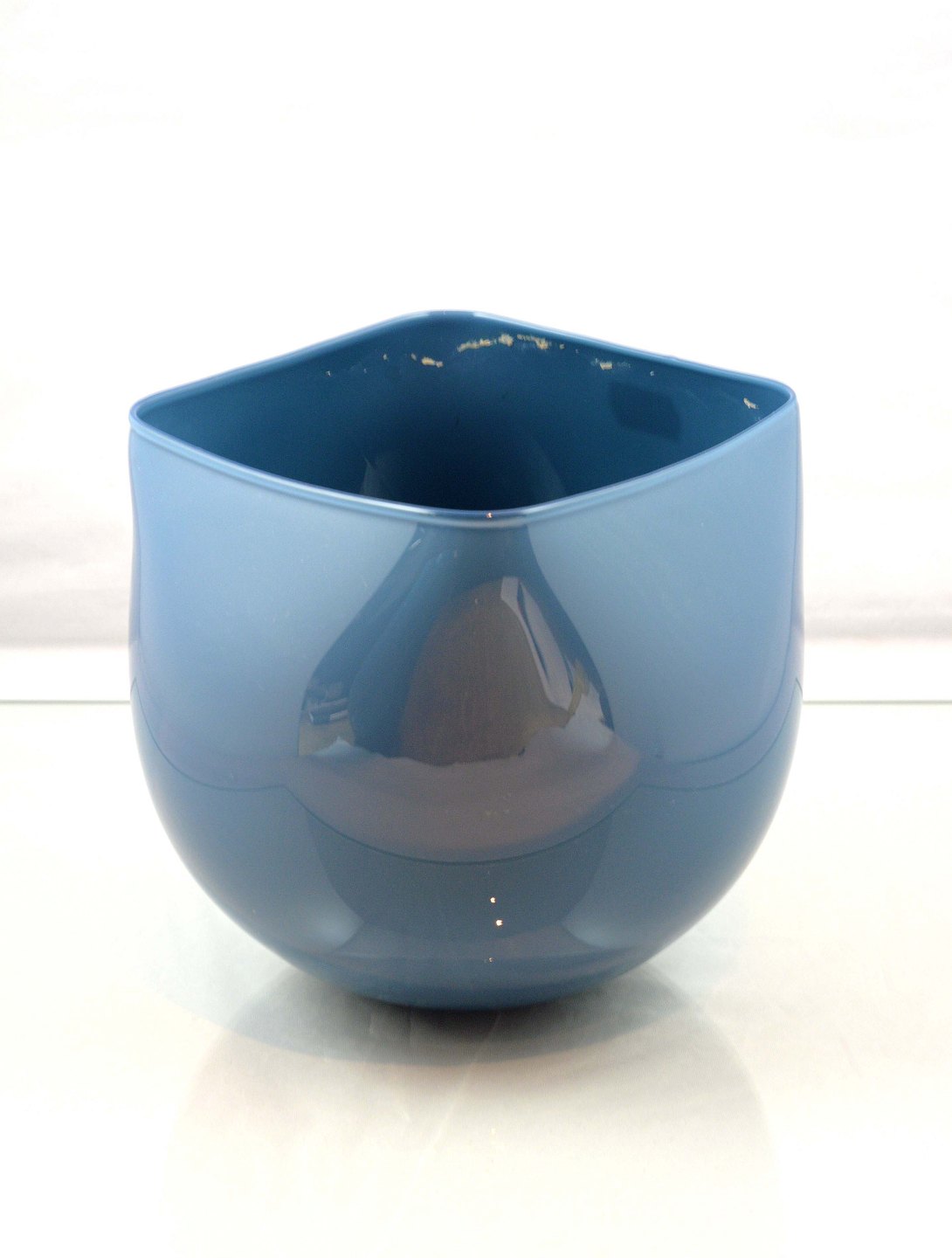 Sæt urtepotteskjulere i støvet blå nuance. Skjulerne er firkantede i toppen og runde i bunden.