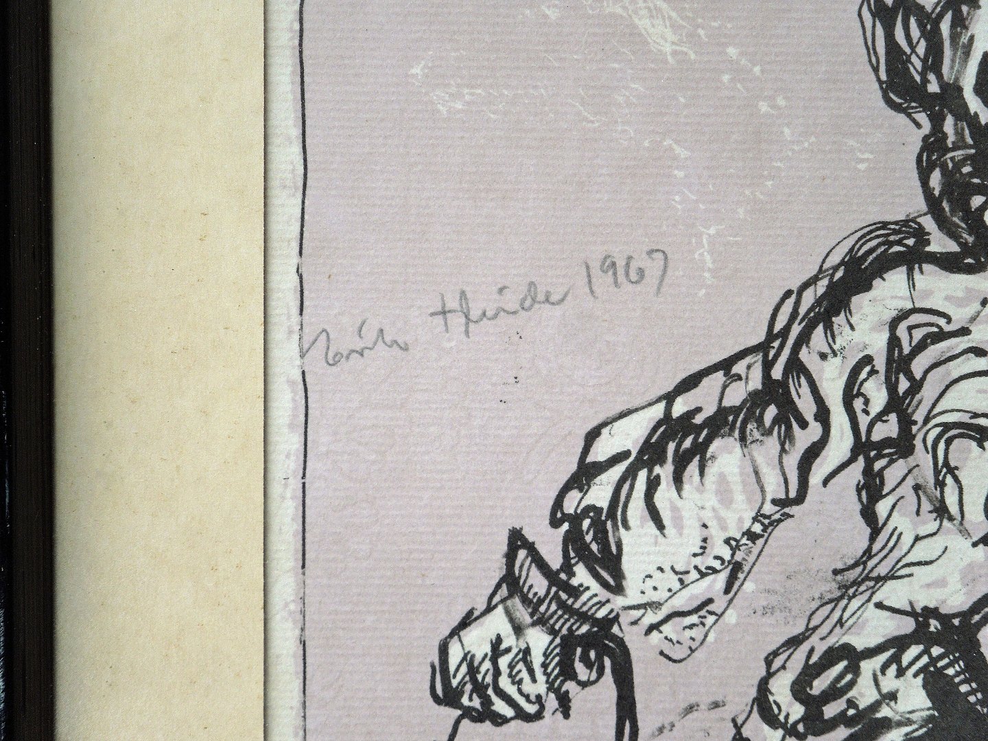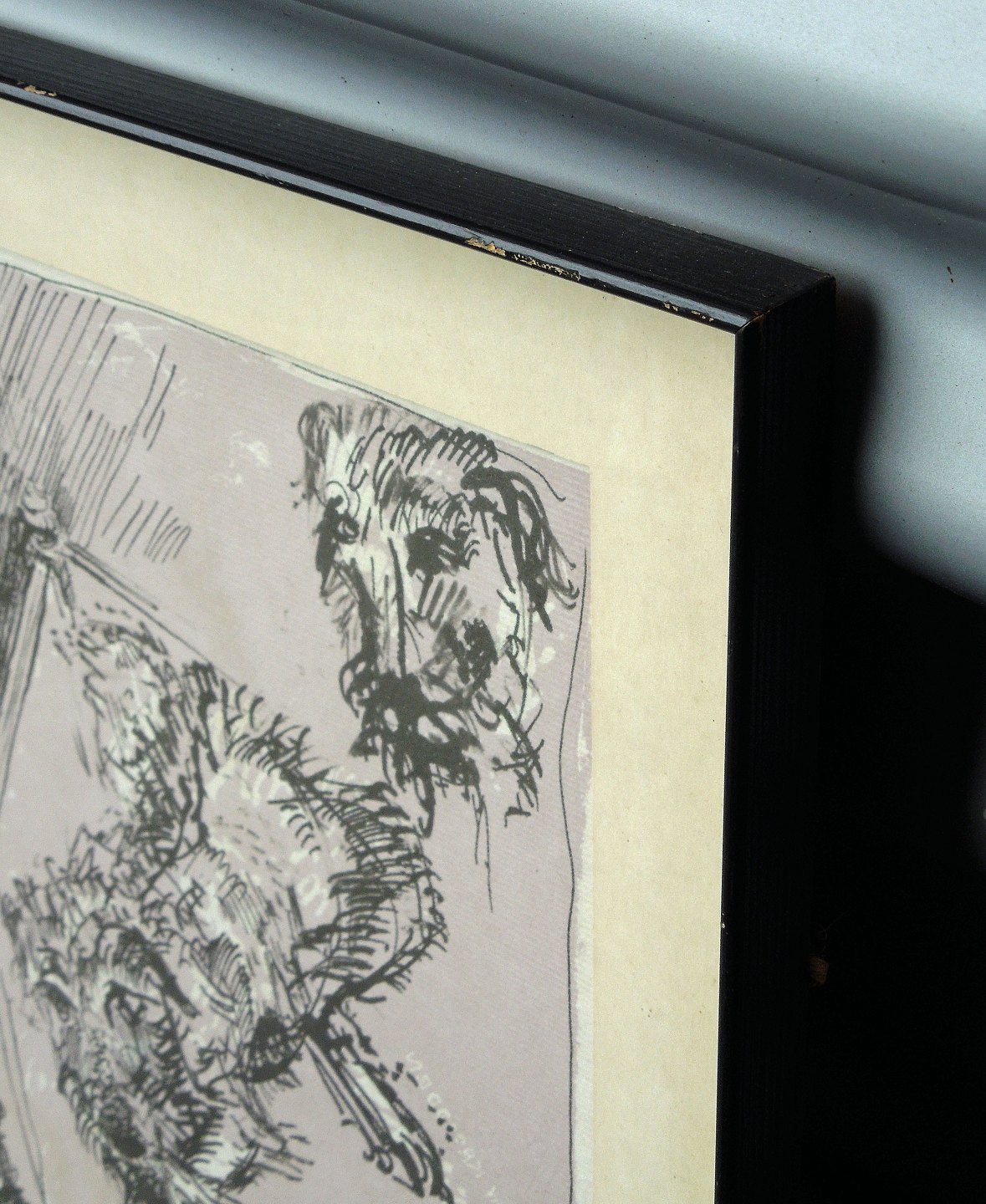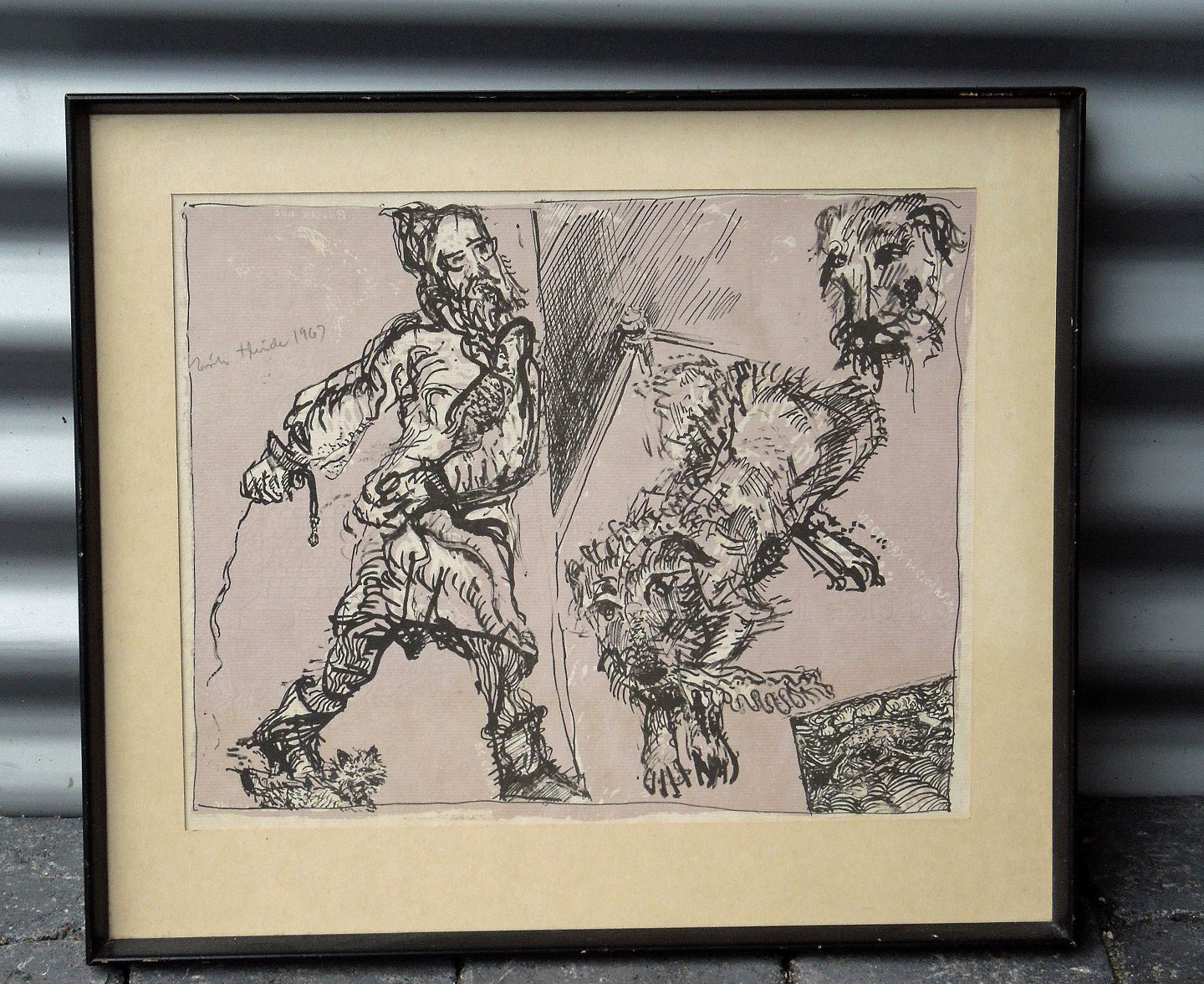 Indrammet litografi med motiv af mand og hunde/ulve af Erik Heidi.